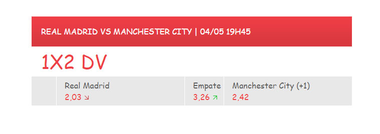 Por exemplo, no jogo de 2ª mão das meias-finais da Liga dos Campeões 2015/2016, entre Real Madrid e Manchester City, o 1X2 DV disponível é o Manchester City (+1).