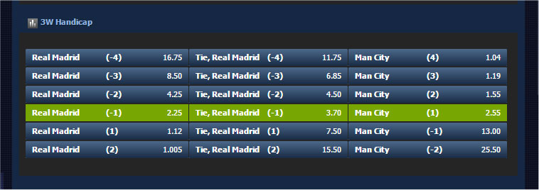 Neste caso, se fizeres uma aposta a favor do Real Madrid, ganhas se o resultado for Real Madrid (2-0) Manchester City, mas perdes se for Real Madrid (1-0) Manchester City. Isto porque o resultado que interessa para saber se ganhas a aposta é o resultado depois de somado o handicap.
