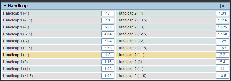No exemplo anterior do jogo da Liga dos Campeões, o único handicap disponível no Placard era o Manchester City (+1). Mas nas casas de apostas online internacionais há vários handicaps europeus e asiáticos disponíveis, desde os europeus Manchester City (-2) a (+4) aos asiáticos Manchester City (-1,5) ao (+4).