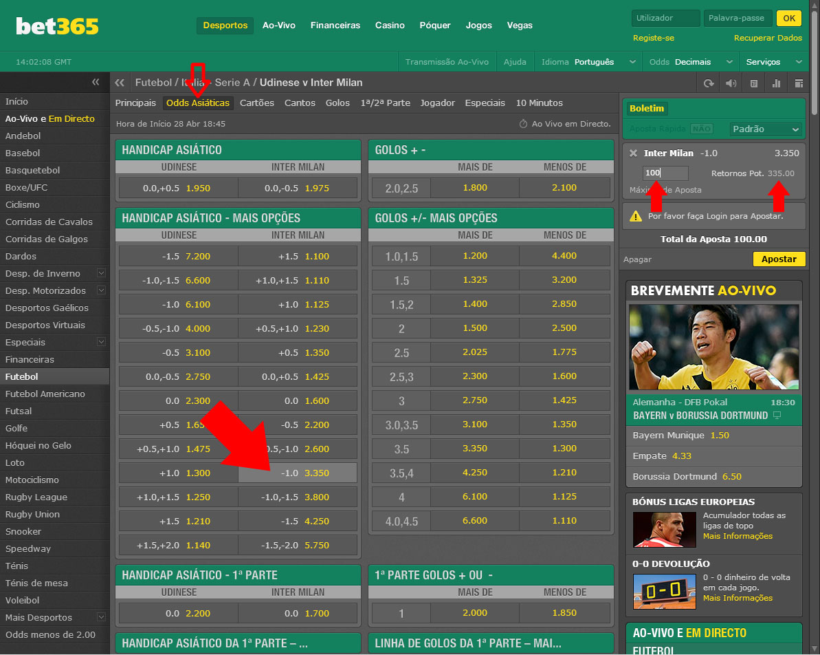 Assim, metade da aposta seria devolvida e a outra metade seria perdida. Ou seja, se apostasses um valor de 10 euros, é como se 5 euros fossem para a aposta “Inter de Milão -1″ e os outros 5 euros fossem para a aposta “Inter de Milão -1,5″.