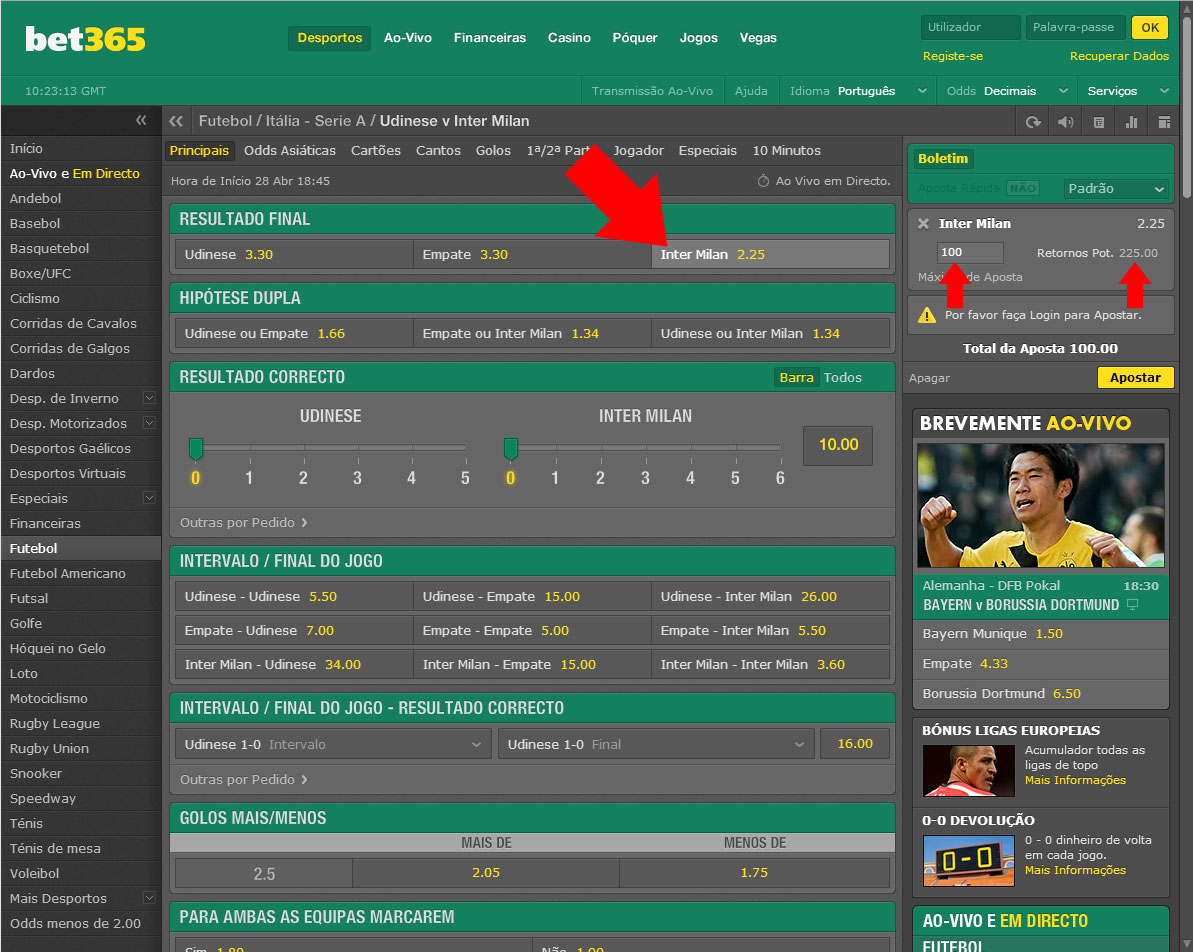 Como já deves saber, cada aposta tem uma odd (valor pago para cada acontecimento). Por exemplo, se apostares 10 euros no Inter de Milão e este ganhar, o valor a receber é (montante apostado vezes a odd, que é 10 euros x 2.25. Ou seja, ganharás 22.5 euros.