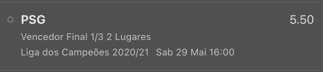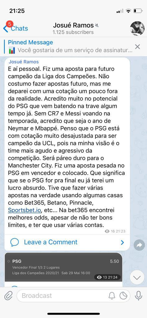 Isso possibilita já ter um lucro bastante alto caso a equipa chegue na final, podendo inclusive fazer uma aposta de cobertura, caso seja a sua preferência. Mas Josué possui um estilo agressivo e foi assim que construiu sucesso. Para ele é Paris Saint-Germain para ser campeão e ponto.
