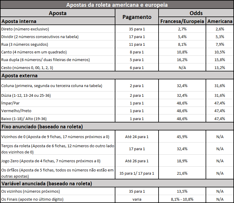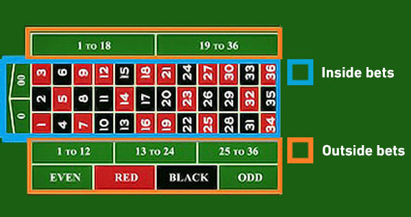 Existem dois tipos de apostas:- Apostas Internas: apostar nos 37 ou 38 números possíveis que constam na mesa da roleta.