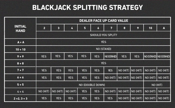Pares entre os valores de dois e sete podem ser separados caso a carta virada do croupier também esteja entre esses valores, porém a mão deste correndo maior risco de estourar. Para entender essas possibilidades, vamos deixar uma tabela abaixo, pois exige um nível de complexidade bem maior.