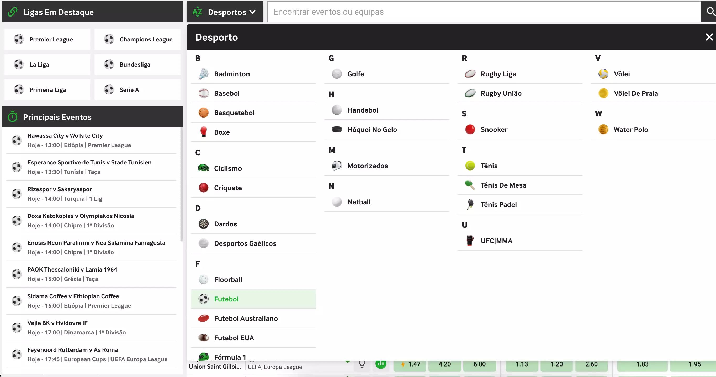 Uma grande seleção de desportos e eventos, incluindo os mais apreciados como futebol, basquetebol, ténis, corridas de cavalos, e outros, deve estar disponível para apostas, por isso, certifique-se de que este é o caso.