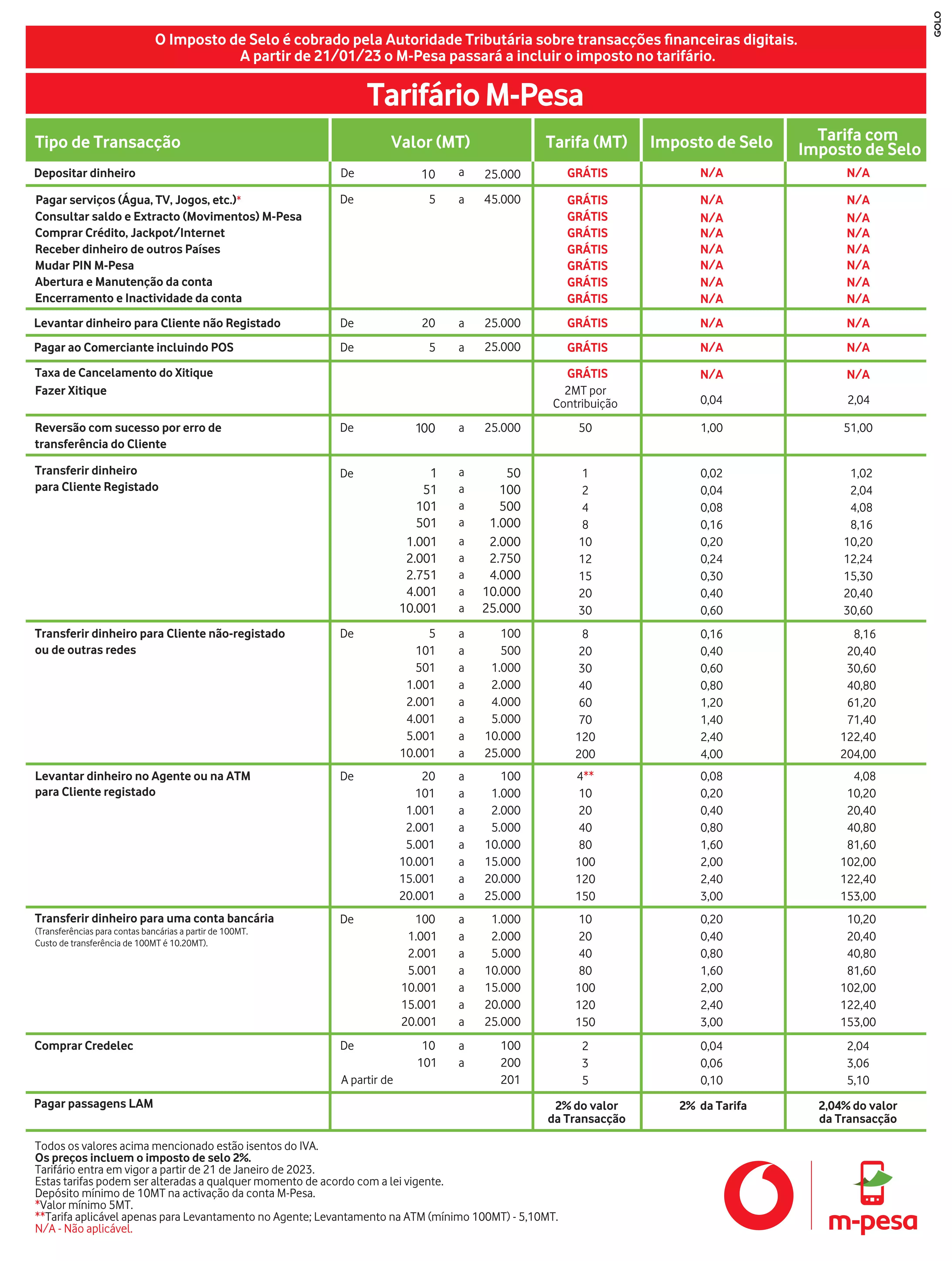 - Tarifas/taxas M-pesa