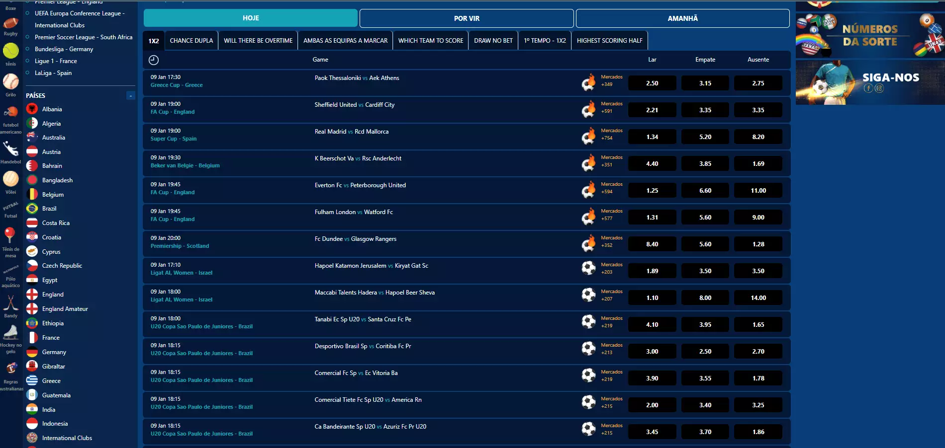 - Escolha o mercado (ex.: resultado final, ambas as equipas marcam);