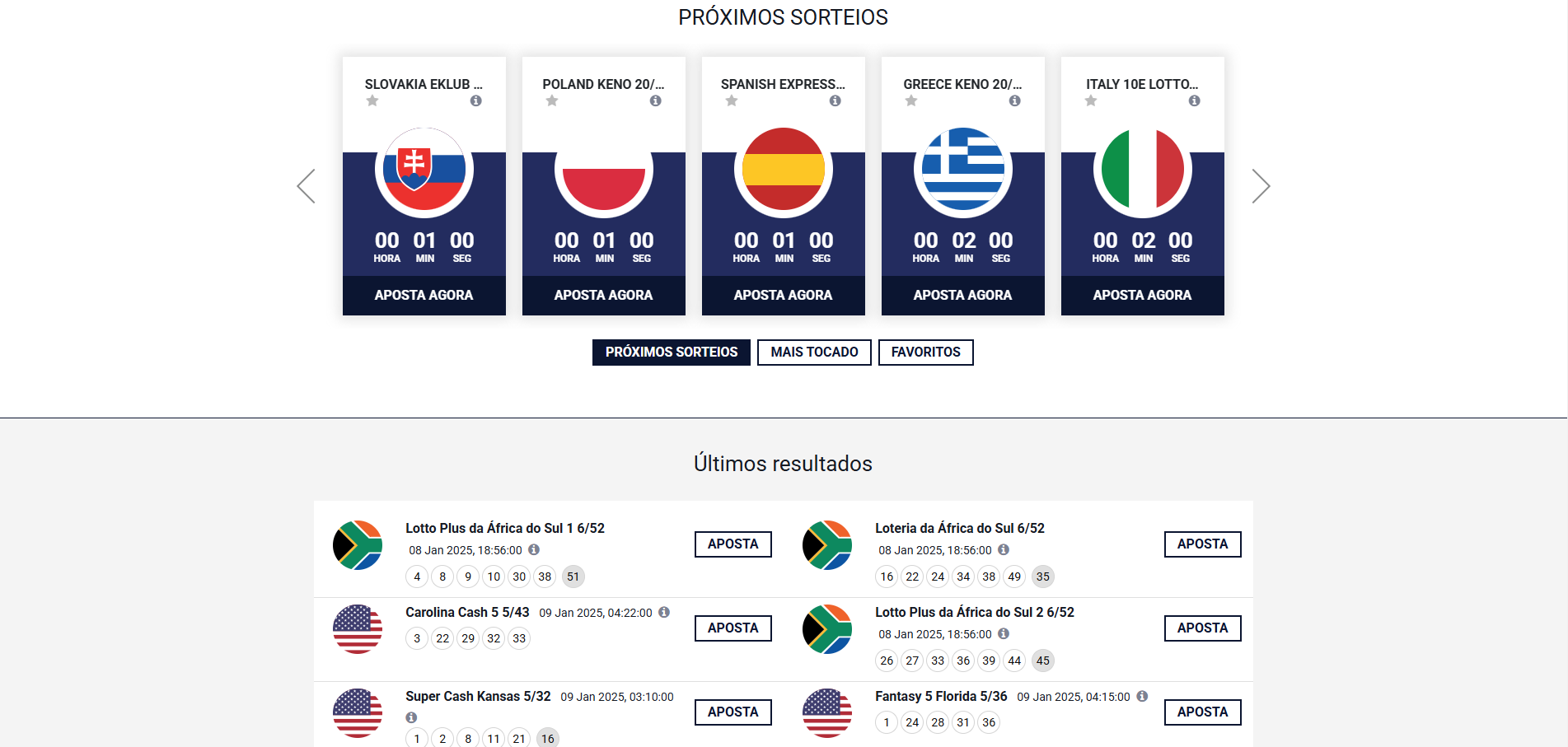 Nesta secção, os utilizadores encontram todas as categorias disponíveis de lotarias internacionais e locais. É possível visualizar os jogos mais populares e os próximos sorteios em destaque.