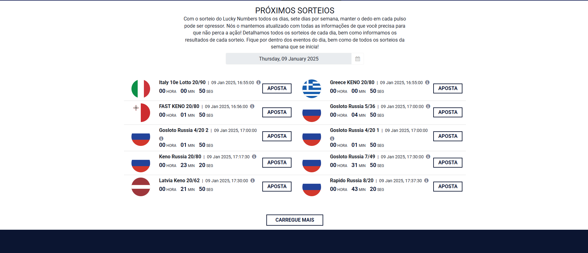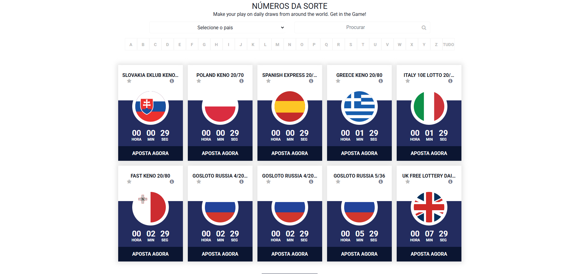 - Escolha o sorteio: Navegue pela lista de sorteios internacionais disponíveis ou encontre os sorteios mais recentes no carrossel da página inicial;