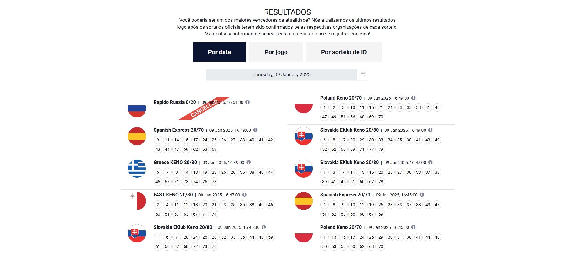 A secção de resultados resume todas as informações sobre sorteios passados. Os utilizadores podem verificar se as suas apostas foram vencedoras e ver detalhes completos, como: