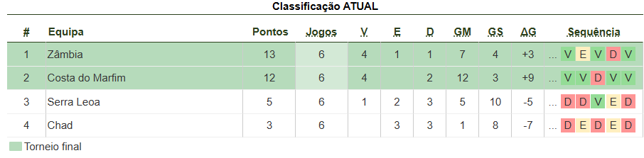 ✅ Grupo G: A Zâmbia dominou o grupo, enquanto a Costa do Marfim garantiu a segunda vaga. Sierra Leona e Chade foram eliminados da corrida.