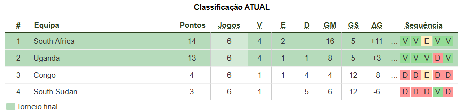 ✅ Grupo K: A África do Sul ficou no topo, com Uganda a assegurar a segunda vaga. O Congo e a Guiné Equatorial ficaram fora da qualificação.