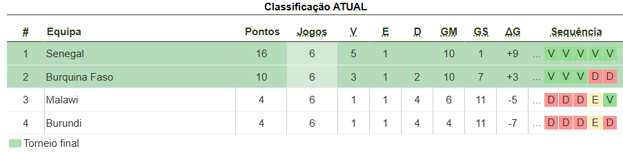 ✅ Grupo L: Senegal, atual campeão, terminou no topo do grupo, com Burkina Faso a garantir a qualificação em segundo lugar. Burundi e Malawi não conseguiram avançar.