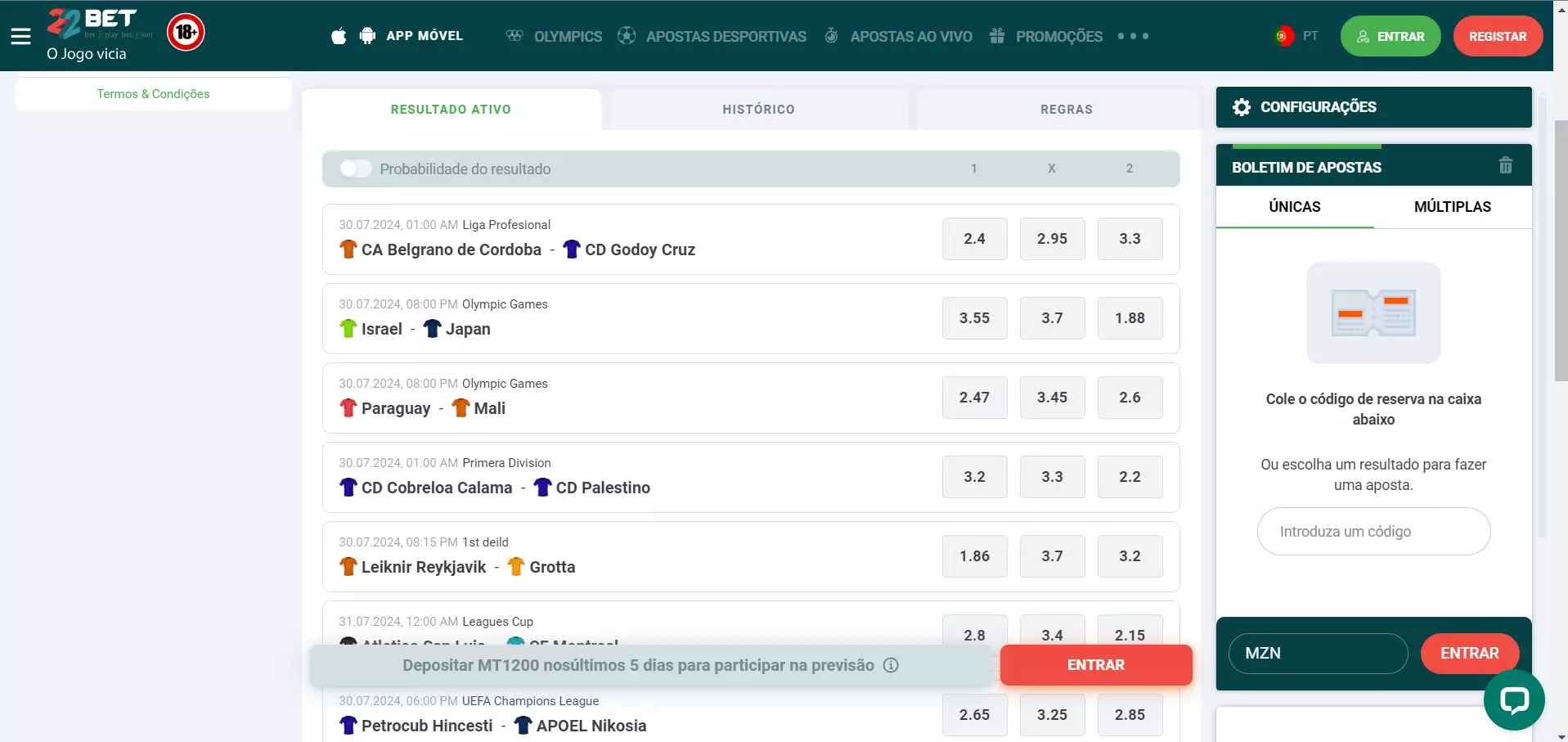 Deposite um montante mínimo de 75 MT e faça uma aposta;