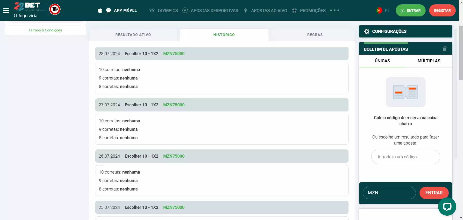 A secção do histórico permite aos apostadores rever os resultados anteriores, oferecendo uma visão das tendências e do desempenho ao longo do tempo.